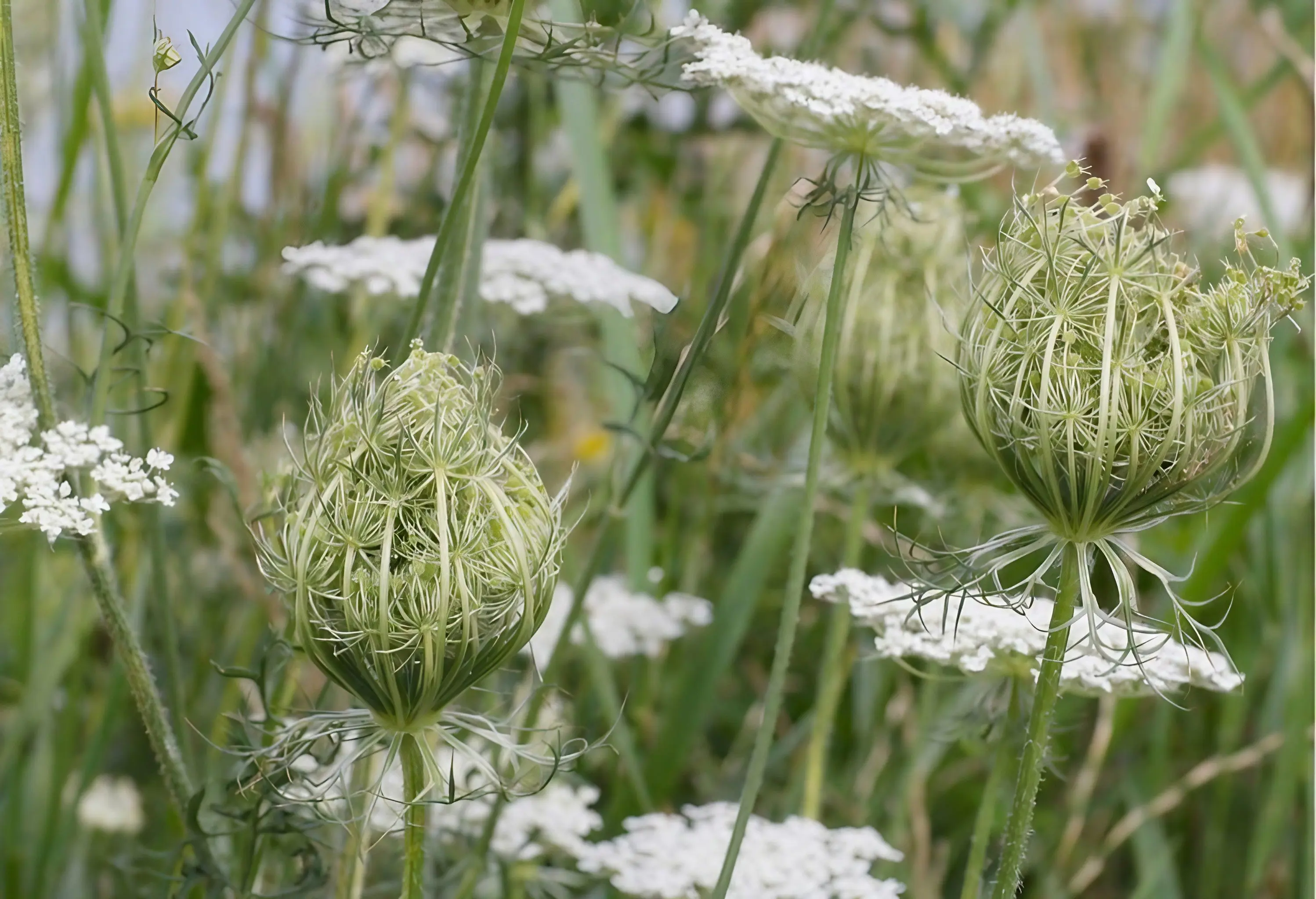 - 🥕 Wild Carrot (Daucus carota): The ultimate architectural filler. Its flat, lacy white umbels provide that essential "cow parsley" look, followed by stunning bird's nest seed heads for winter structure.